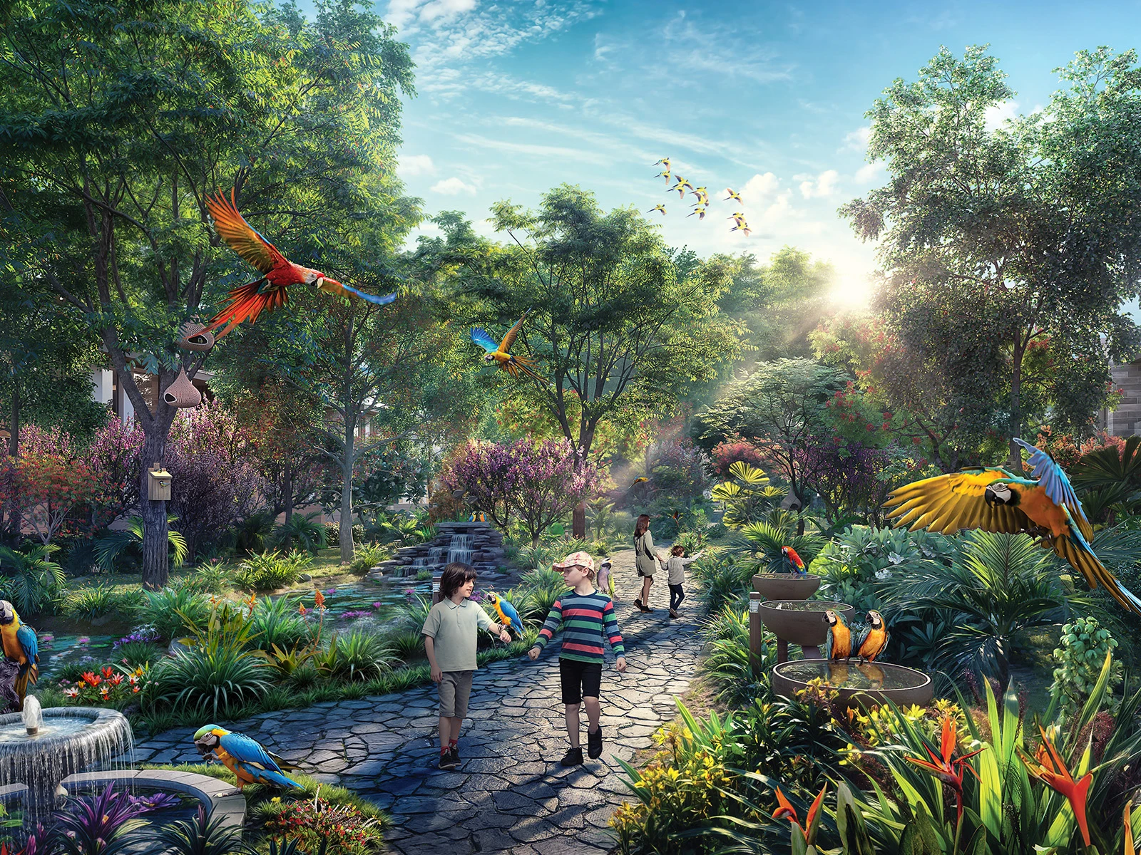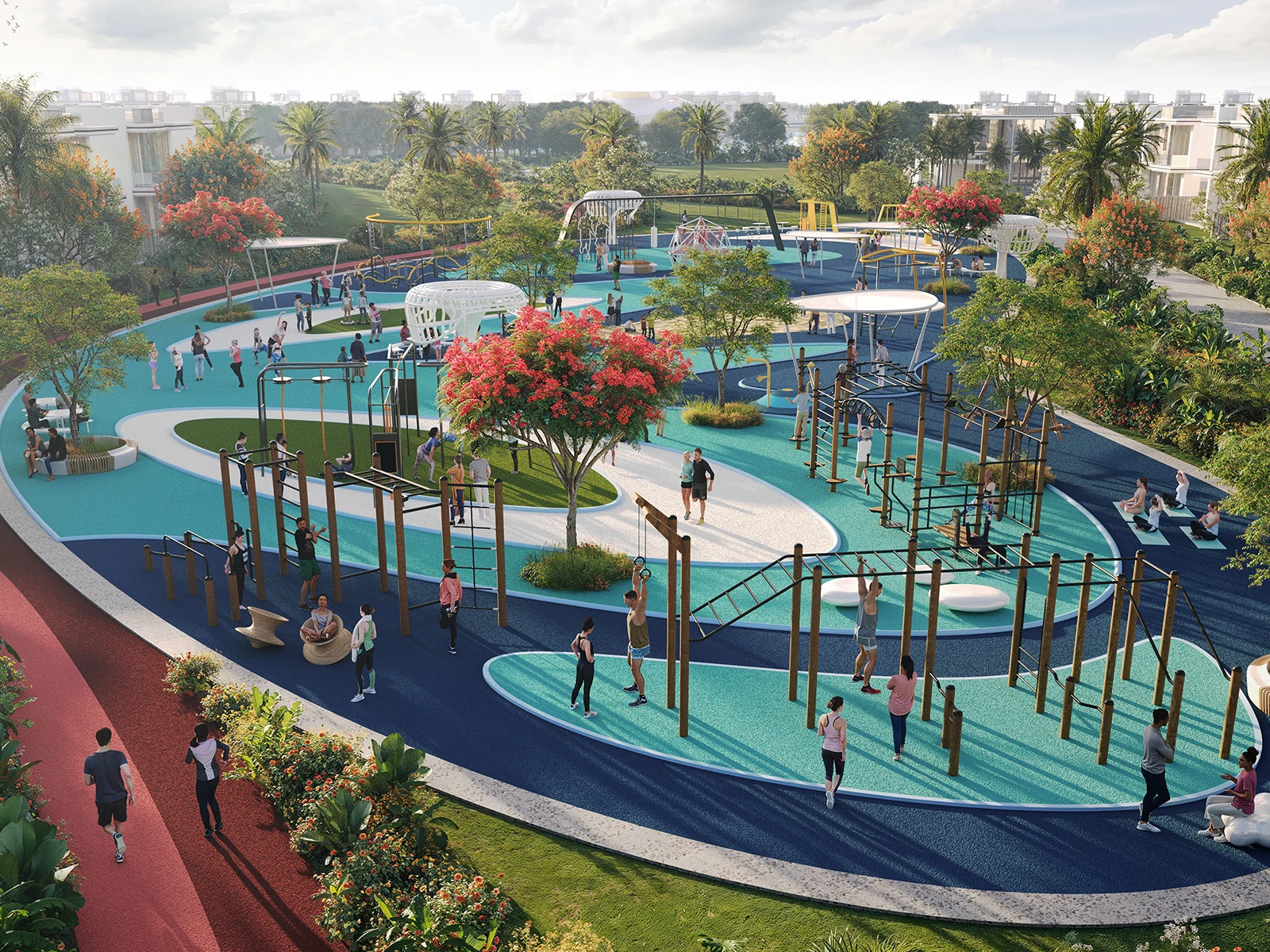 Hot Spring Spa, Yoga Floating Decks, Fitness & Calisthenics Parks