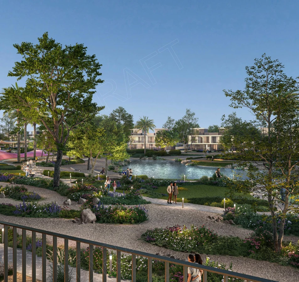 The community boasts a wide range of world-class amenities, including multiple sports courts (tennis, padel, basketball), a skate park, adventure playgrounds for children, yoga and meditation decks, sensorial gardens, and pedestrian-friendly promenades.